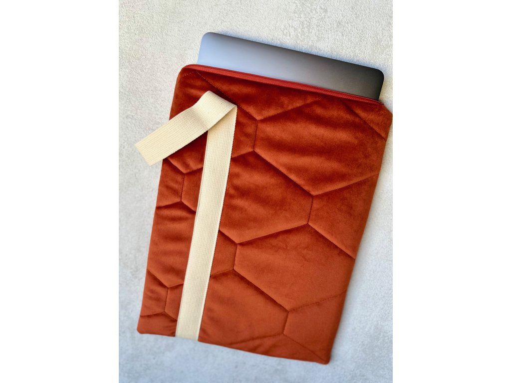 pouzdro je ušité ze sametového proševu a bavlněného popruhu. je vyztužené vatelínem. podšívka je z nepromokavého polyesteru a chrání tak notebook před případnou vlhkostí.